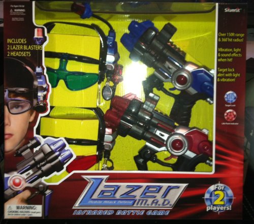 Target lock alert with light & vibration.Ages 8+.Includes 2 Lazer blasters & 2 headsets.Range of over 150ft & 360 degree hit radius.Vibration, light & sound effects when hit!..2-Player - LAZER TAG Mobile Attack Defend Infrared Battle Game Features.